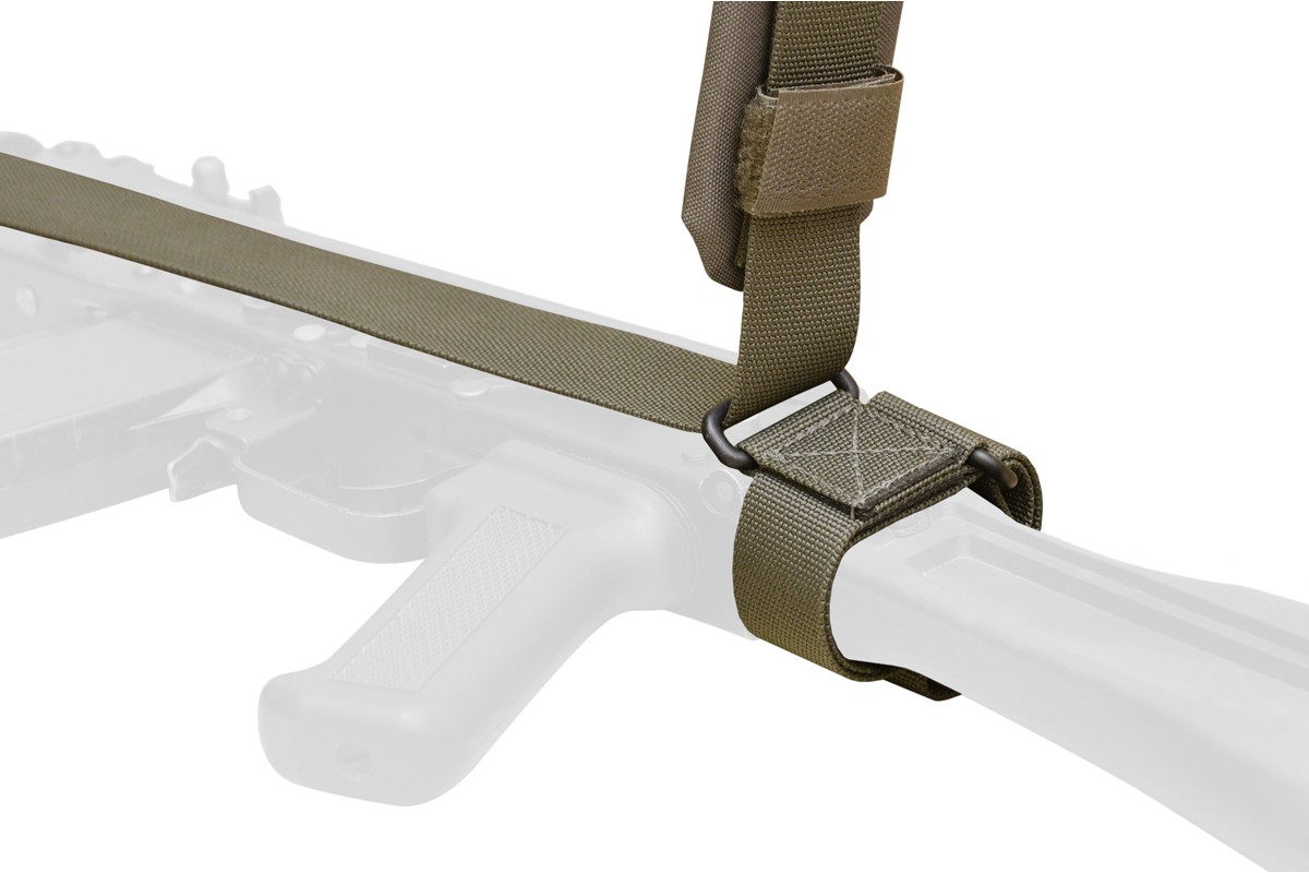 В боевом положении ремень полностью высвобождает оружие, что позволяет перекладку на "слабое" плечо,стрельбу вверх или из положения лежа.