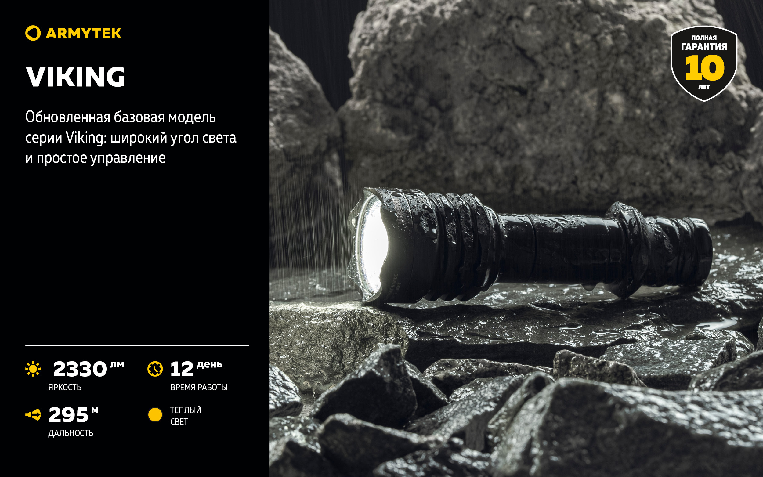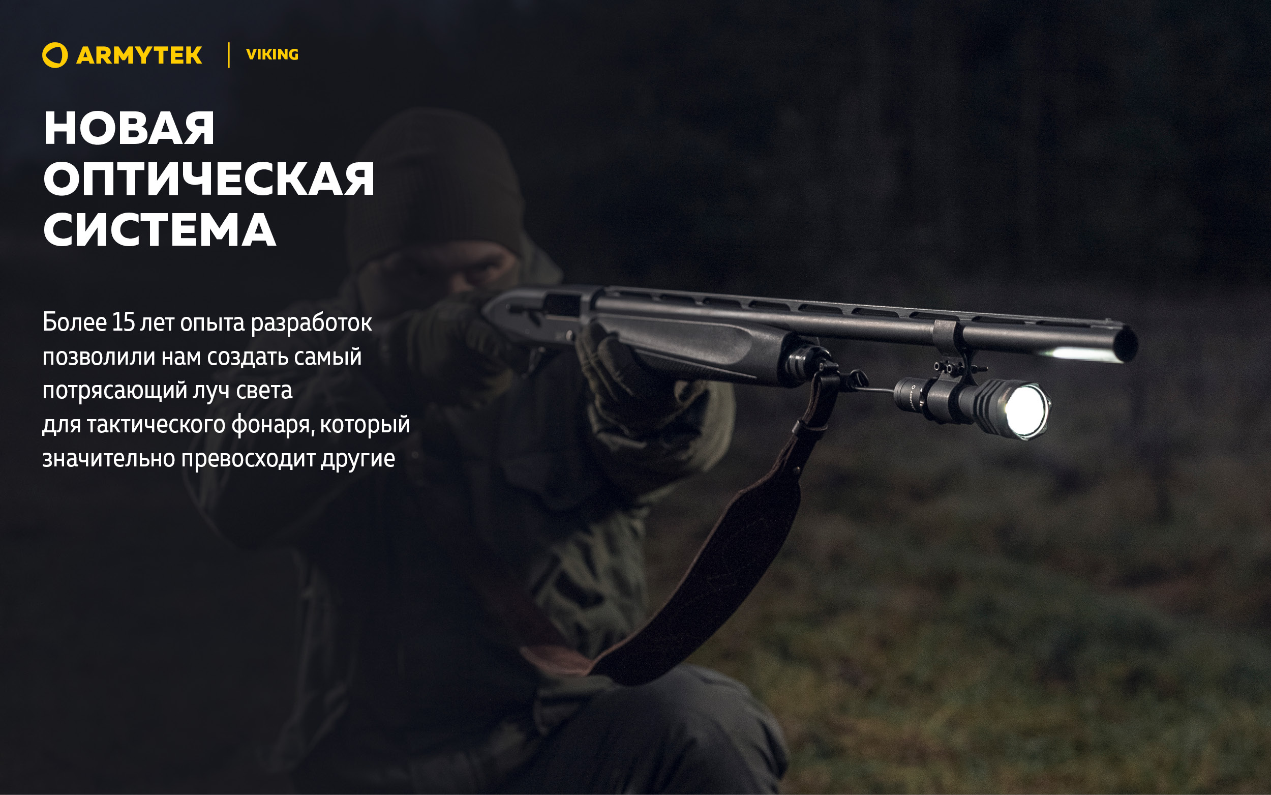 Новый Viking — это в два раза более яркий фонарь с широким светом для решения тактических задач и охоты на обширных территориях. Большое центральное пятно и широкая боковая засветка позволяют высвечивать значительное пространство на ближней и средней дистанции. Обновленный Viking работает на любом стандартном аккумуляторе 18650 Li-Ion или на двух литиевых батарейках CR123A. Вариативность элементов питания позволяет дополнительно повысить автономность. Как и в прошлой версии, аккумулятор и зарядное устройство в комплект не входят. Фонарь совместим с оригинальной выносной кнопкой и оригинальными или универсальными креплениями для подствольного применения.