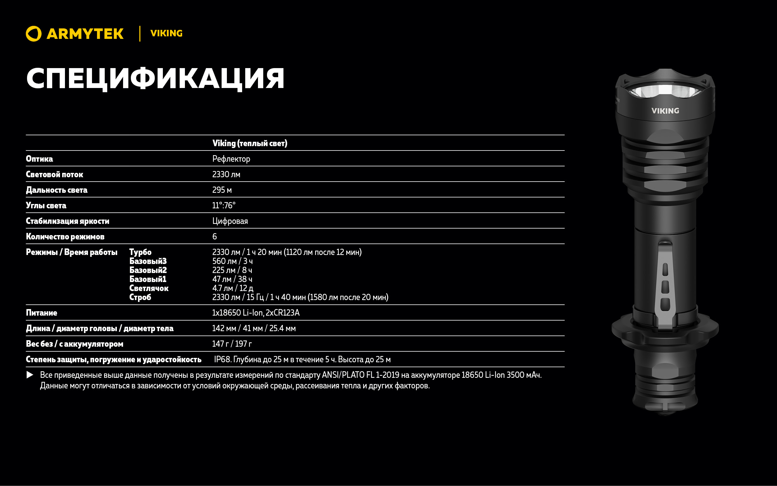 Фонарь тактический Armytek Viking Теплый / 2330 лм / 295 м / 11°:76° / 1x18650 или 2xCR123A (F01802W)