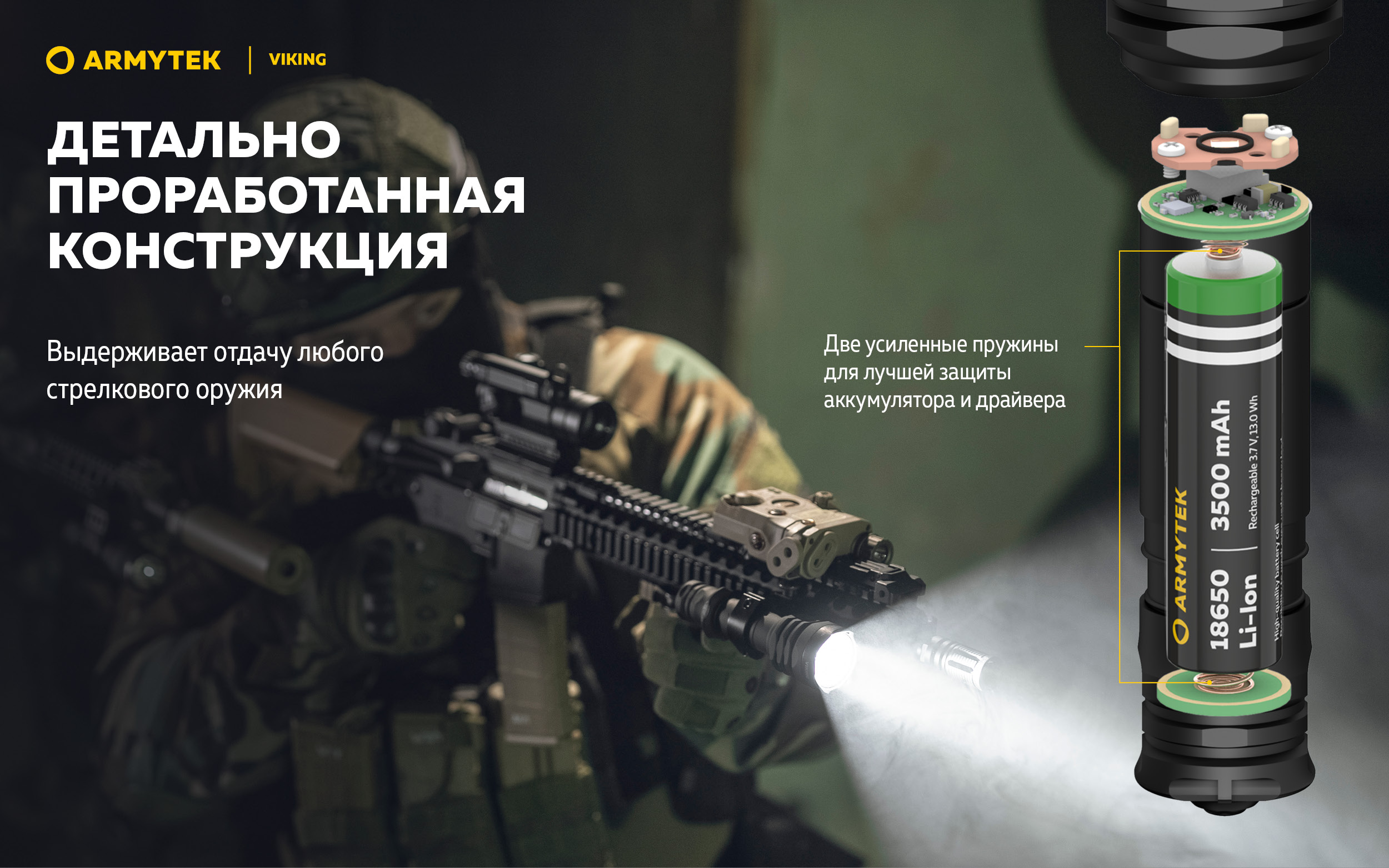 - Использование двух усиленных пружин в конструкции фонаря для лучшей защиты аккумулятора и драйвера. Фонарь выдерживает отдачу любого стрелкового оружия.