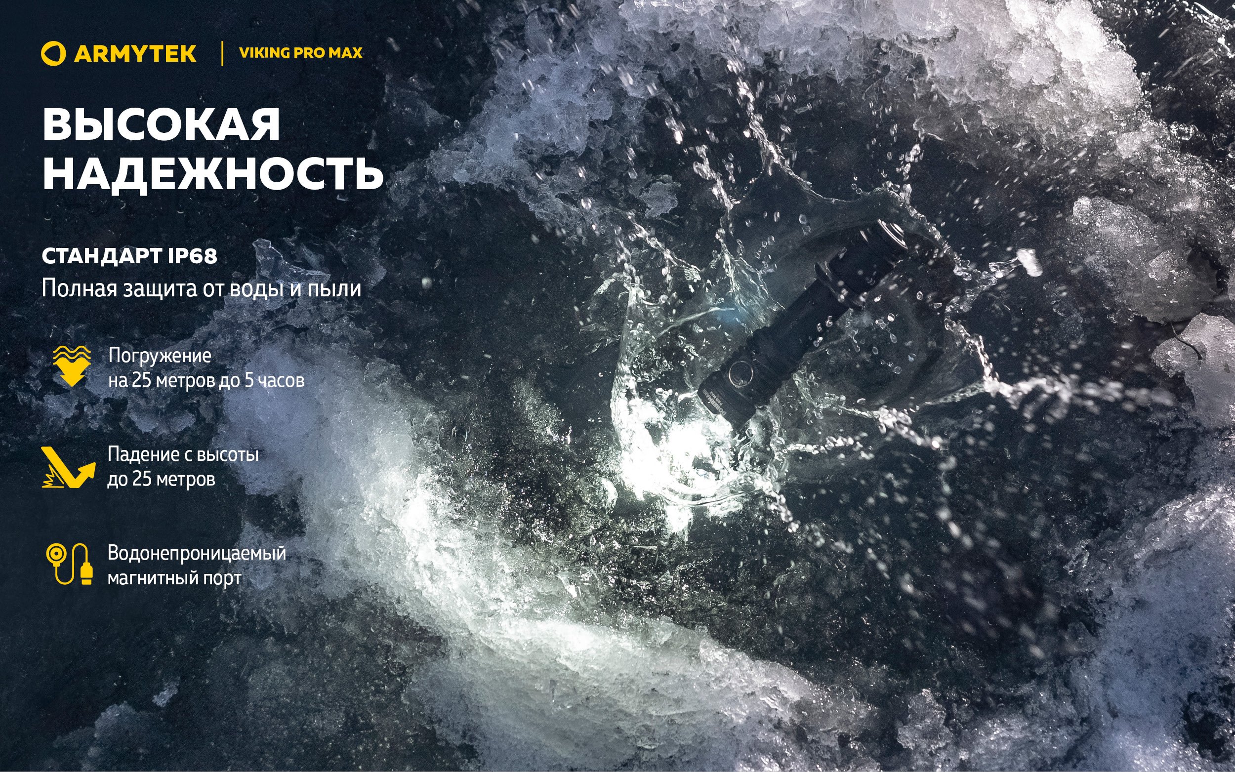 - Полная защита от воды, грязи и пыли по стандарту IP68 — фонарь продолжает работать даже после погружения на глубину 25 метров. Выдерживает падение с 10 этажа.