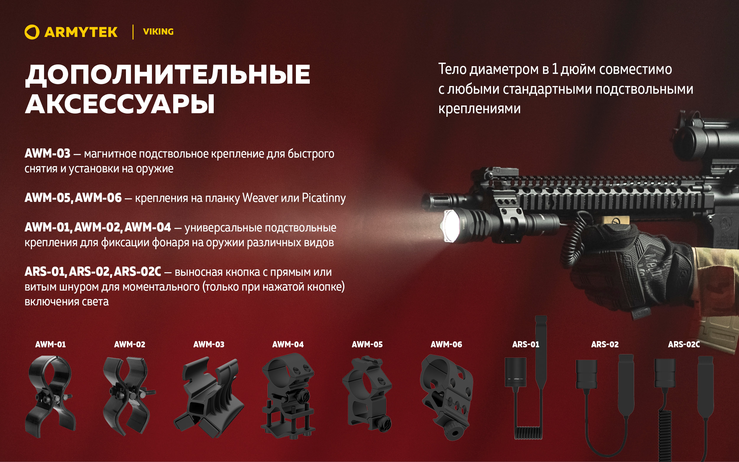 - Стандартное тело диаметром в 1 дюйм совместимо с тактическими аксессуарами.