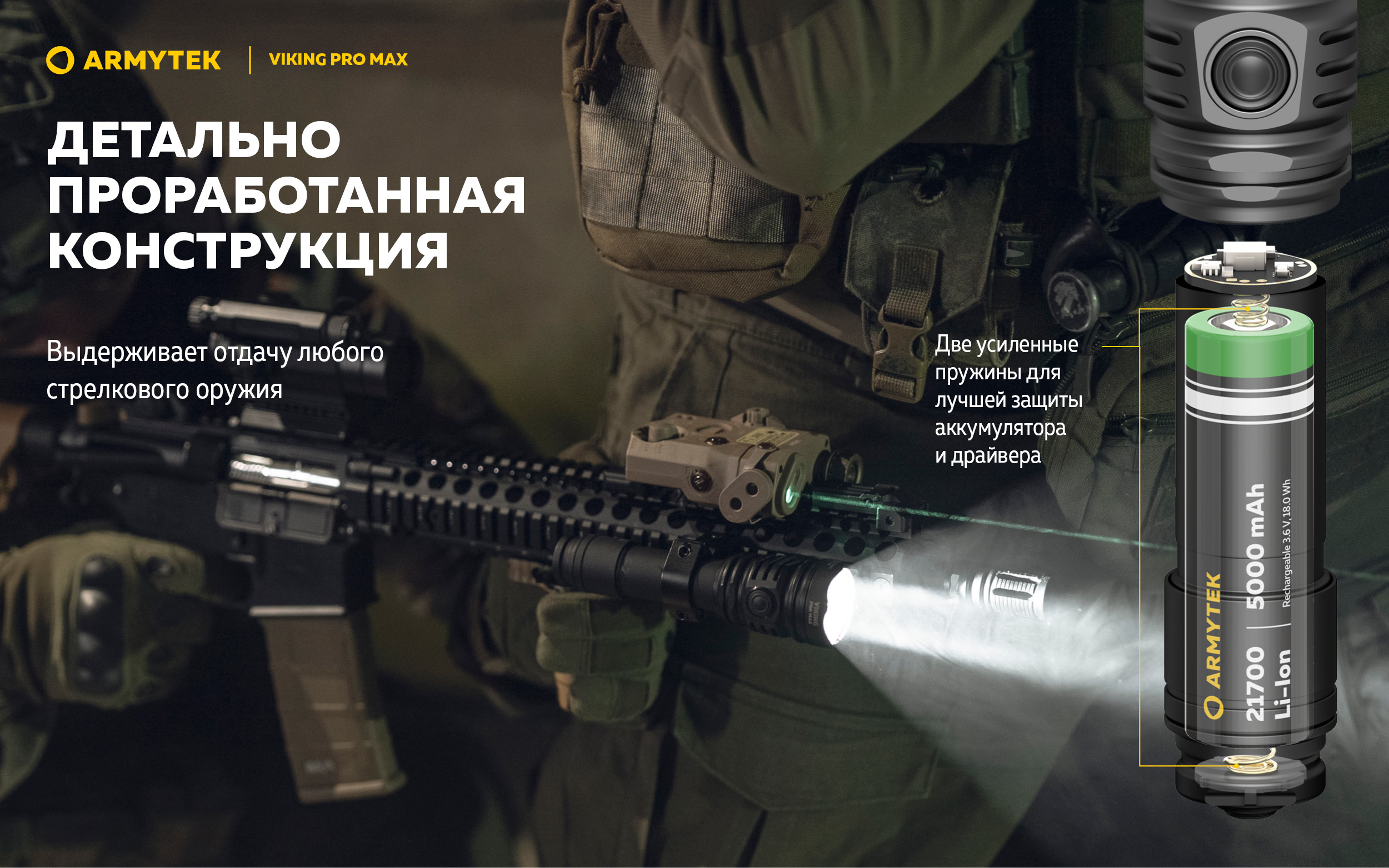 - Использование двух усиленных пружин в конструкции фонаря для лучшей защиты аккумулятора и драйвера. Фонарь выдерживает отдачу любого стрелкового оружия.
