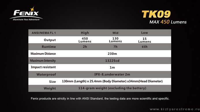 Фонарь Fenix TK09 уникален наличием тактической кнопки нового типа, которая обеспечивает мгновенную активацию фонаря, непрерывную работу и смену режимов. На корпусе фонаря выполнена объемная накатка для комфортного удержания в сложных условиях и кольцо для тактического хвата. Fenix TK09 – превосходный тактический фонарик для суровых условий.
