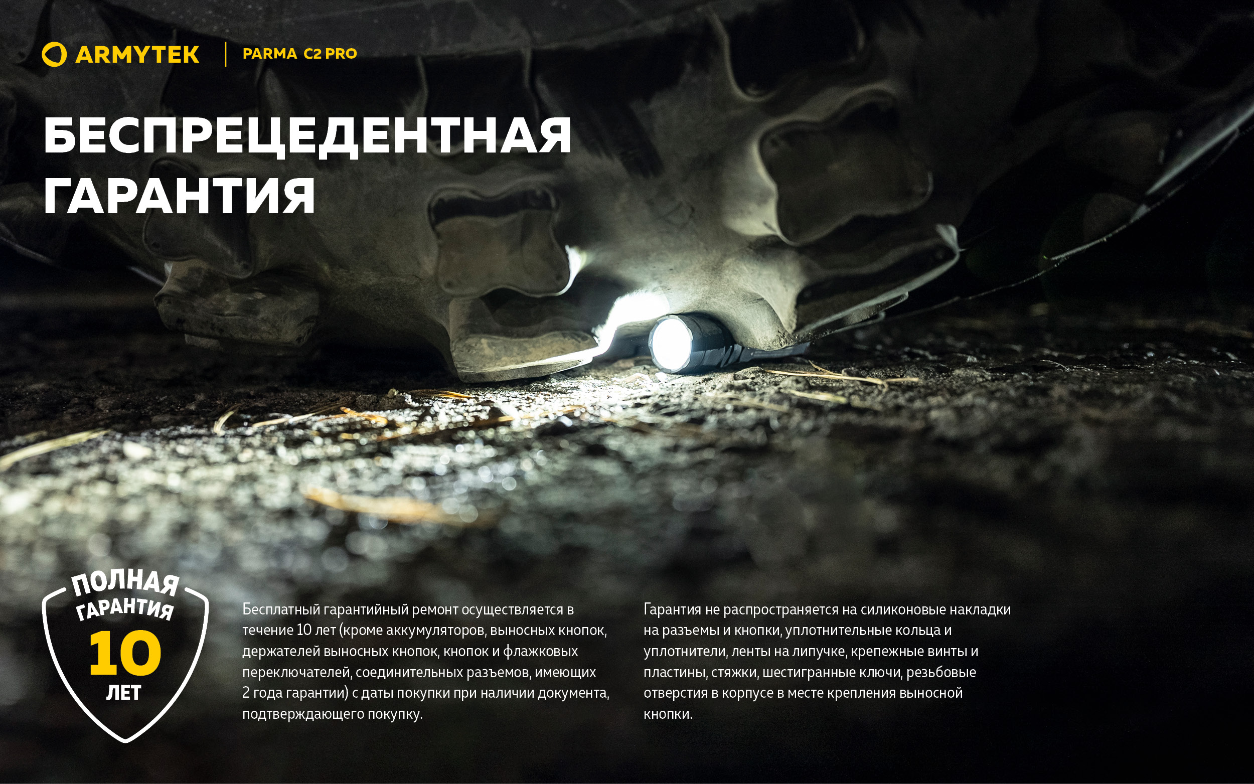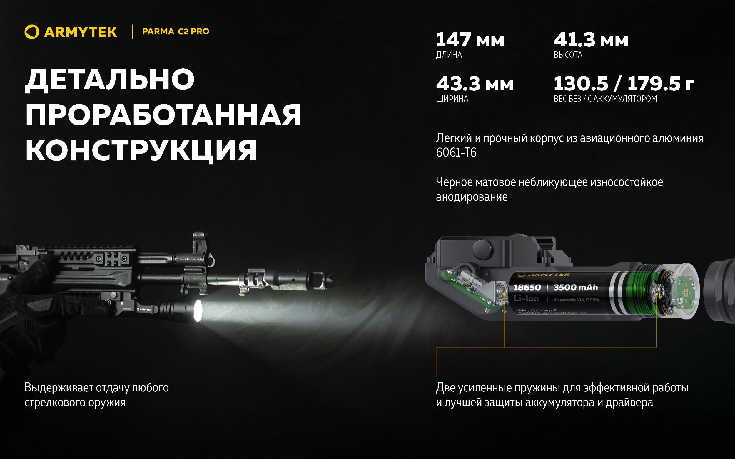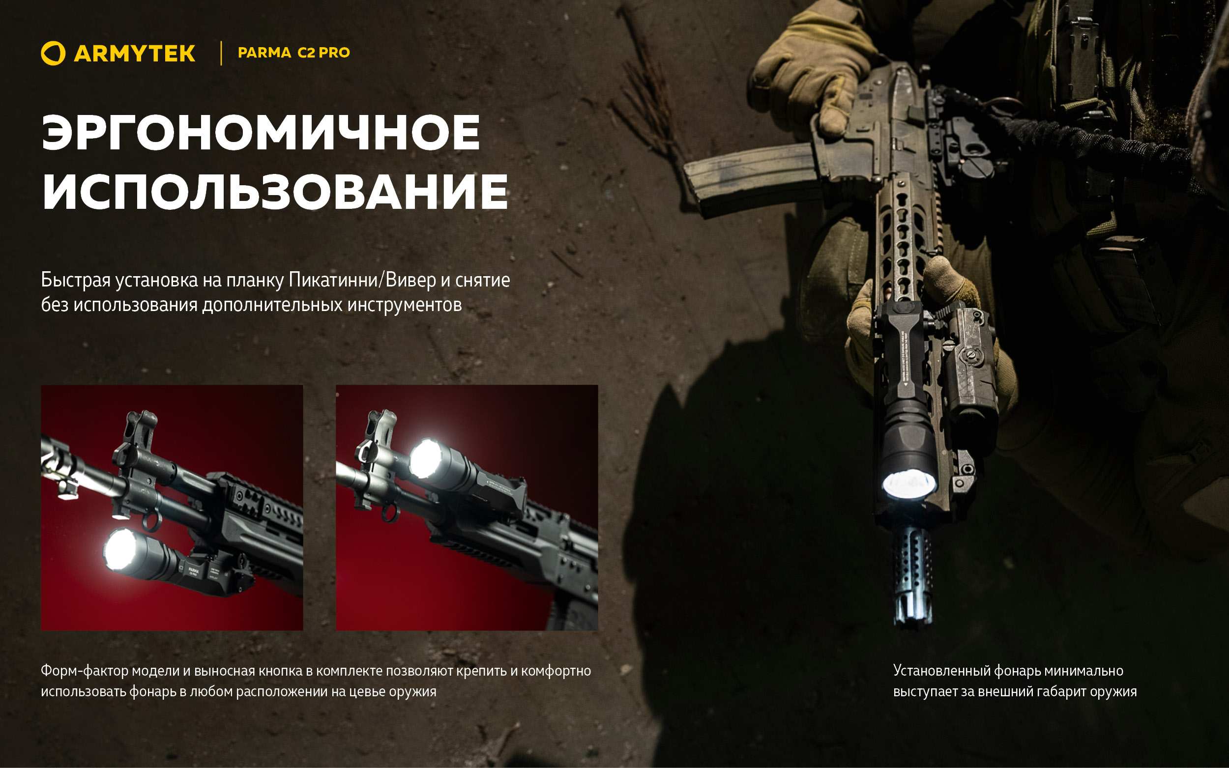 Фонарь тактический Armytek Parma C2 Pro Белый свет, 3 режима, до 350 м., 1500 люмен, 1x18650 или 2xCR123A (F09804C)