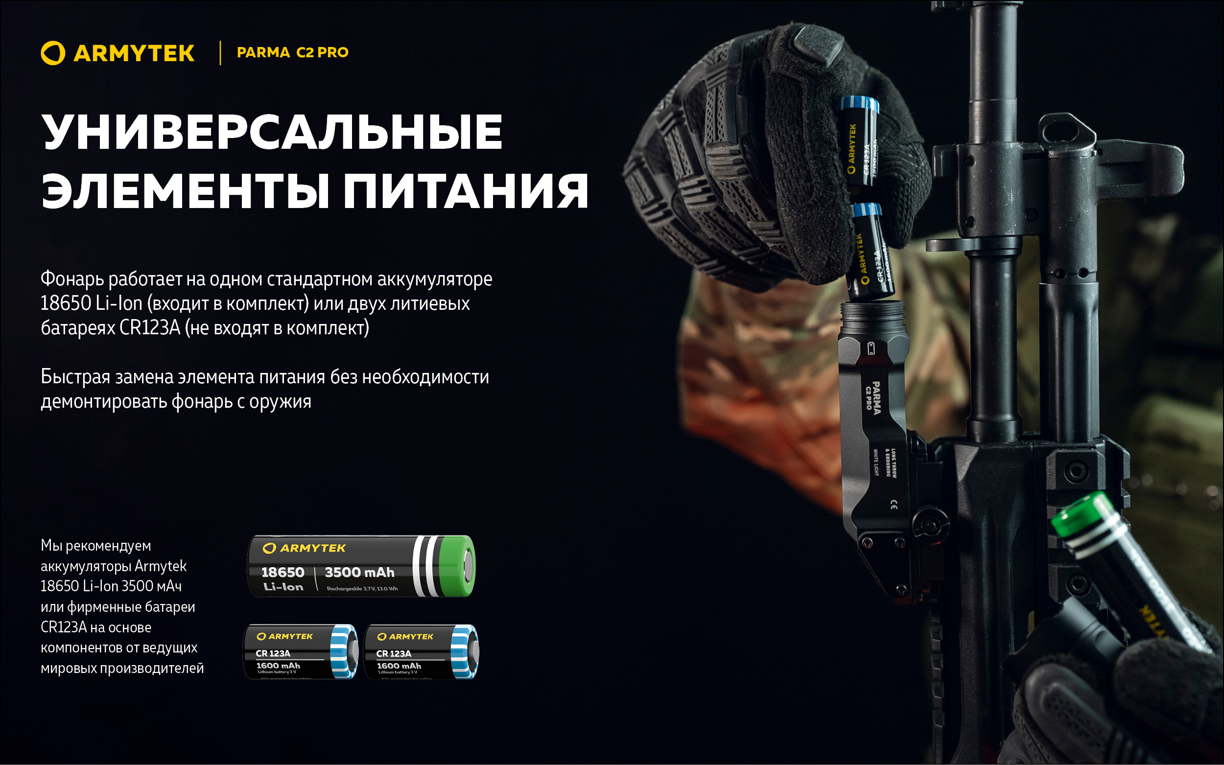 Совместимость с элементами питания: 1x18650 Li-Ion, 2хCR123A;
