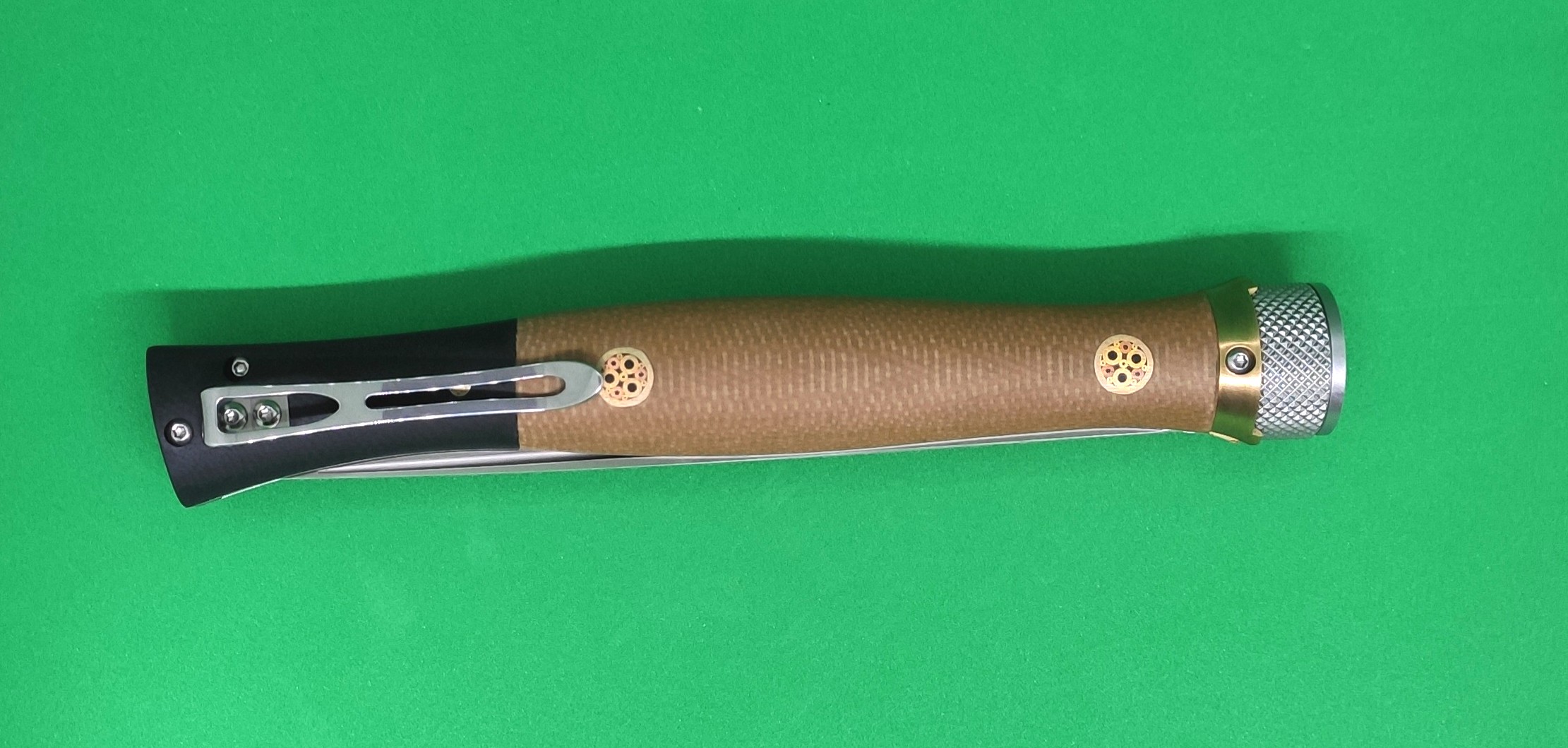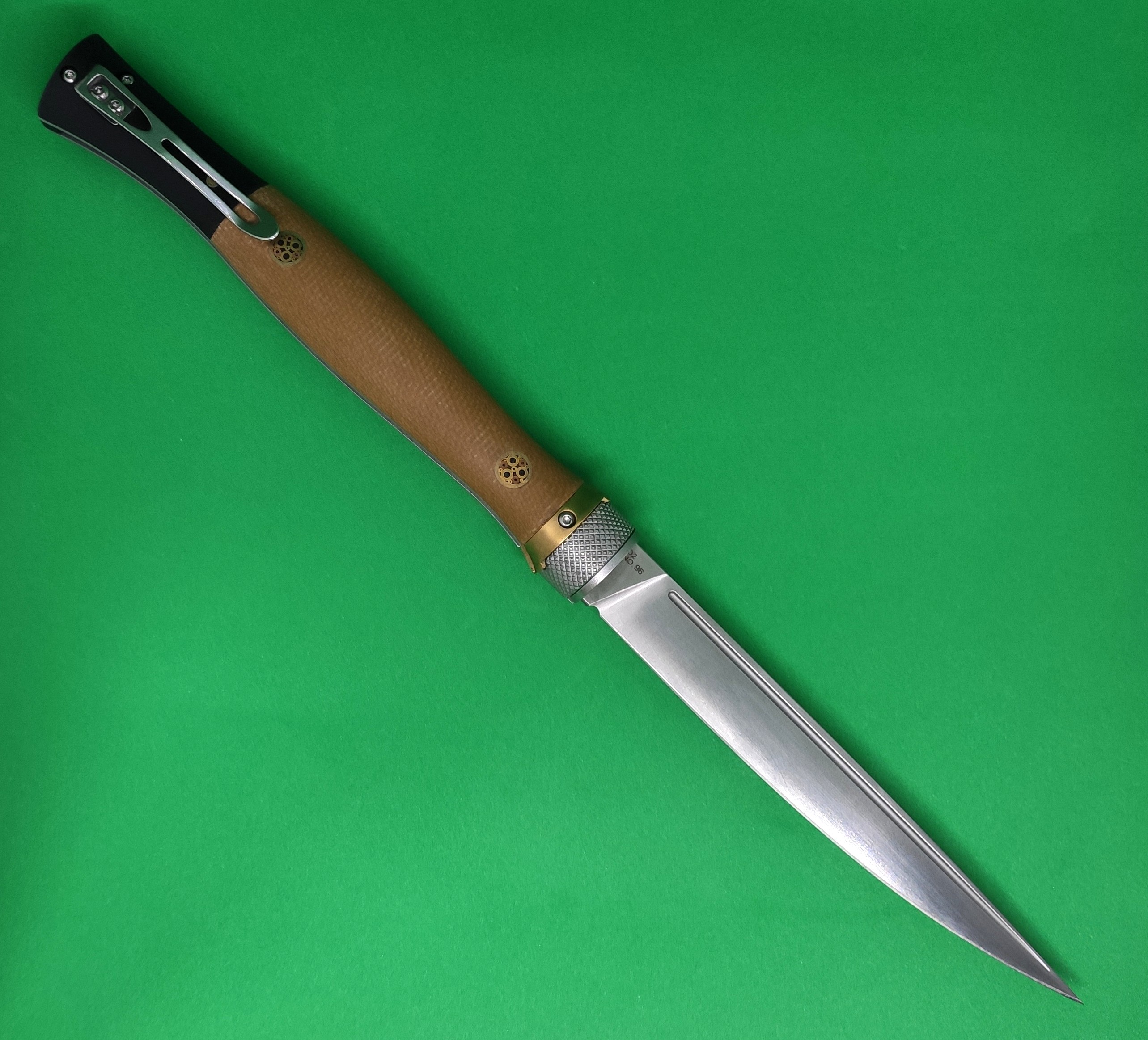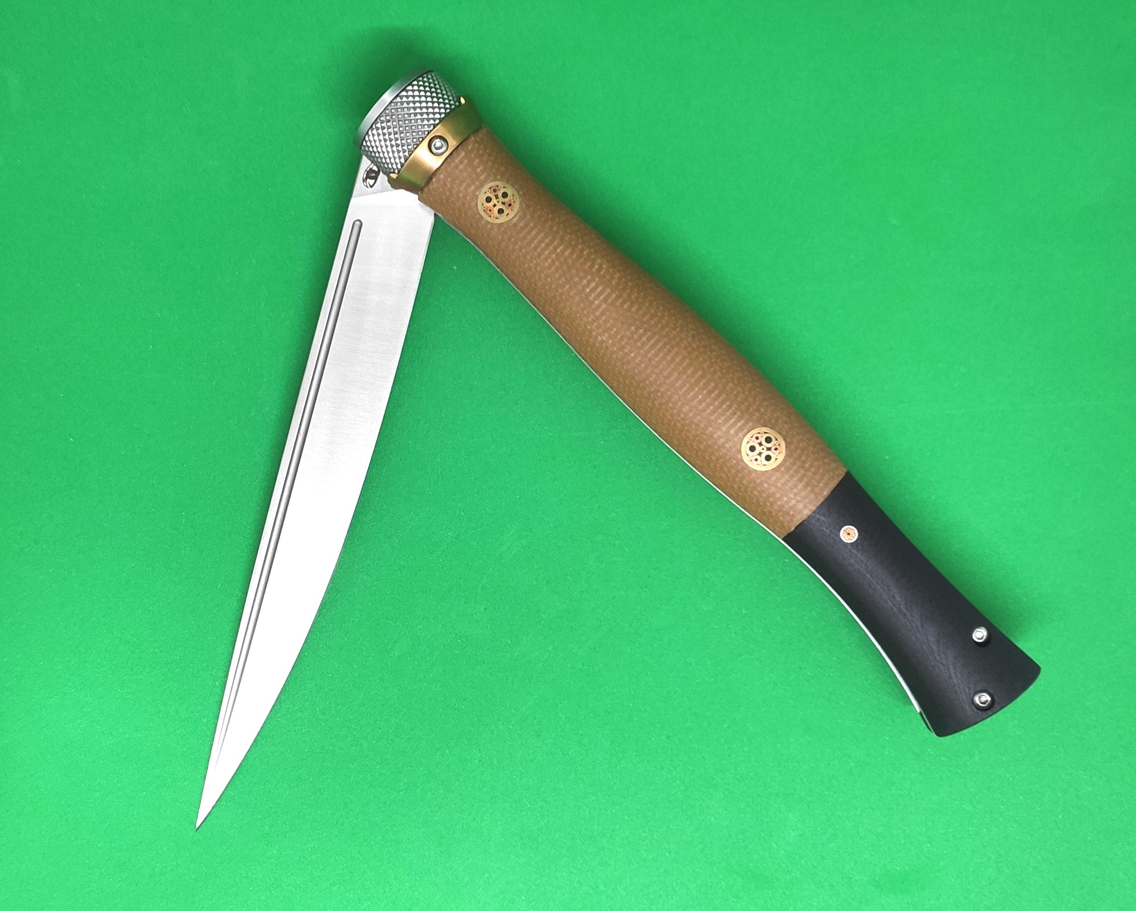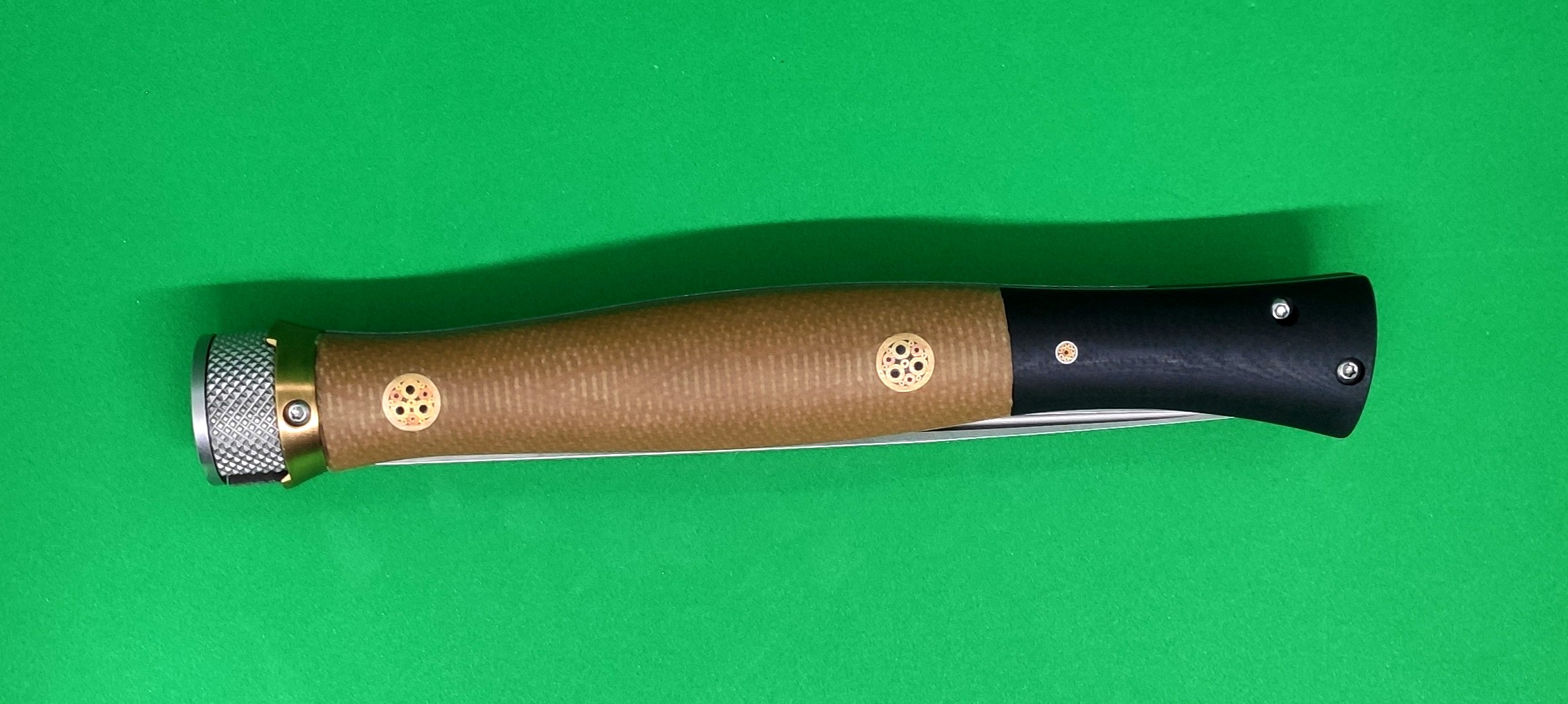- рукоять изготовлена из микарты (современный лёгкий и живучий материал) Эргономичная форма рукояти обеспечивает уверенный хват, а декоративные латунные пины придают ножу утончённый внешний вид;