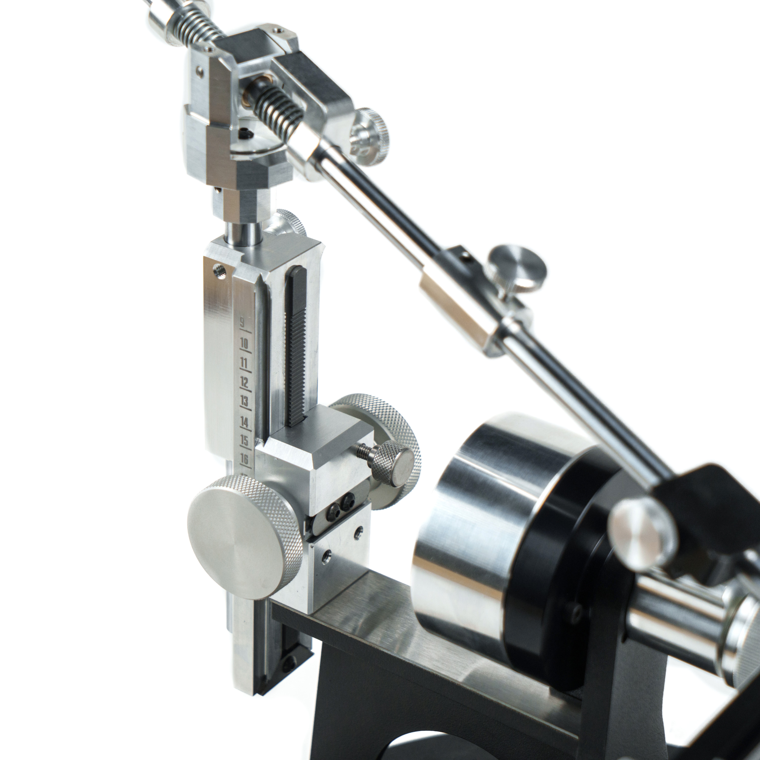Универсальный держатель позволят использовать с точилкой любые абразивные камни как на бланках, так и без бланков. Держатель абразива не имеет металлической подложки, но благодаря специальной геометрии упоров позволяет фиксировать абразивы максимально надежно. Штанга держателя абразива имеет увеличенную длину в 694 мм, выполнена из стали и обладает высокой жесткостью. Штанга держателя — разборная и соединяется алюминиевой втулкой-муфтой, с посадочным креплением «на три точки», что дает максимальную соосность соединения. Для регулировки штанга оснащена удобным винтом-барашком, соединение штанги происходит одним движением.