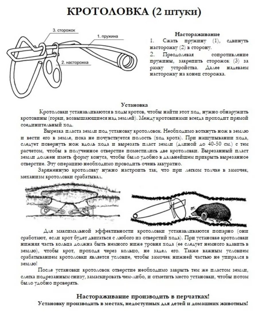 Сделана из пружинной проволоки и стального листа. Устанавливается в ходы кротов. Чтобы найти ход, нужно обнаружить кротовины (горки, возвышающиеся над землёй). Между кротовинами всегда проходит прямой соединительный ход.