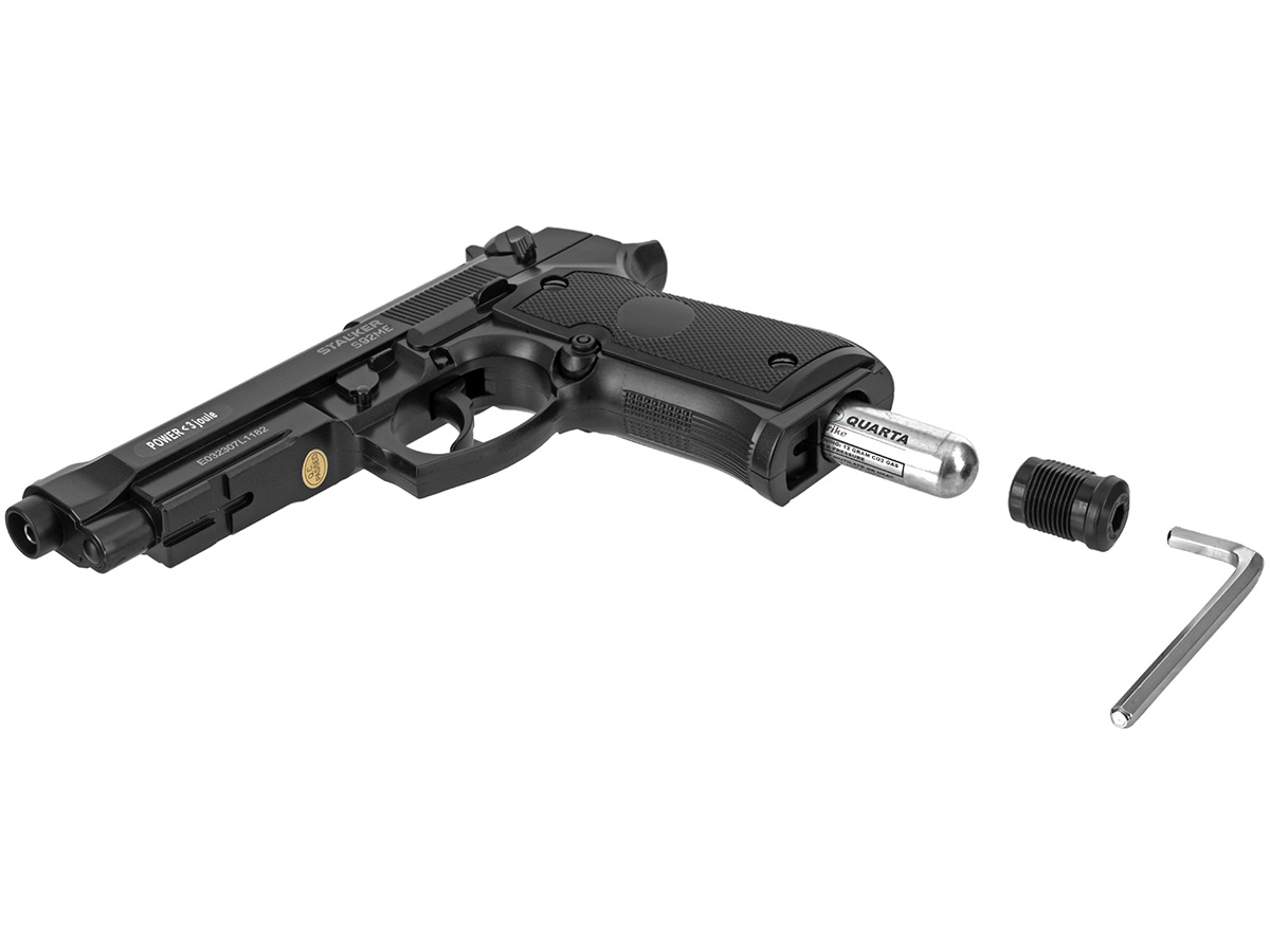 Stalker S92ME стреляет металлическими шариками диаметром 4.5 мм, а в качестве источника энергии используется стандартный 12-ти граммовый баллон СО2 12 г., расположенный в рукояти.