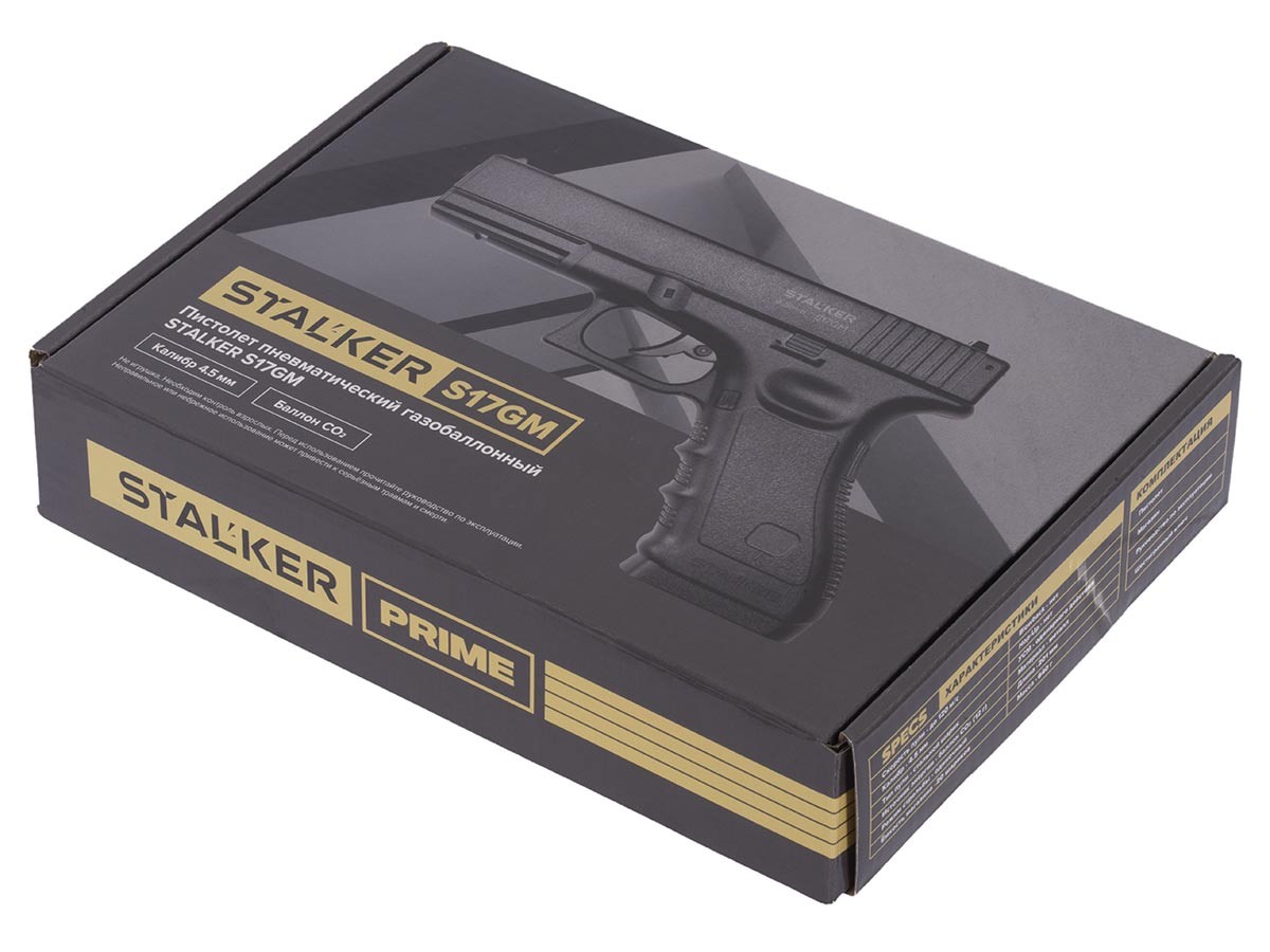 Пневматический пистолет Stalker S17GM, входящий в серию PRIME, создан на основе известного австрийского пистолета Glock 17 третьего поколения. Это полноразмерный пистолет, своим внешним видом и массо-габаритными характеристиками похожий на боевой прототип. Имеет дульную энергию менее 3 Джоулей, поэтому не является оружием, что позволяет приобретать его без каких-либо лицензий и разрешений.