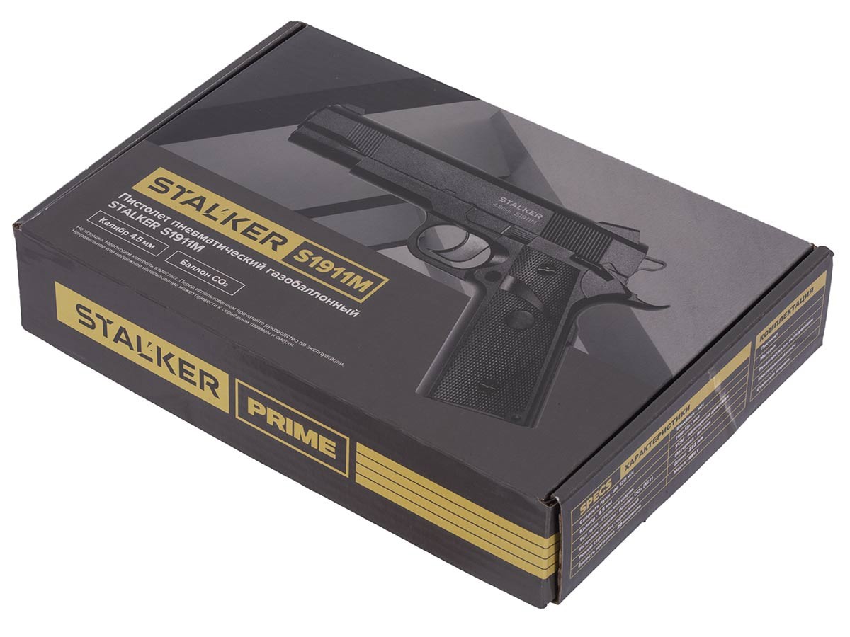 Пневматический пистолет Stalker S1911M, входящий в серию PRIME, создан на основе легендарного американского пистолета Colt M1911. Это полноразмерный пистолет, своим внешним видом и массо-габаритными характеристиками похожий на боевой прототип. Имеет дульную энергию менее 3 Джоулей, поэтому не является оружием, что позволяет приобретать его без каких-либо лицензий и разрешений.