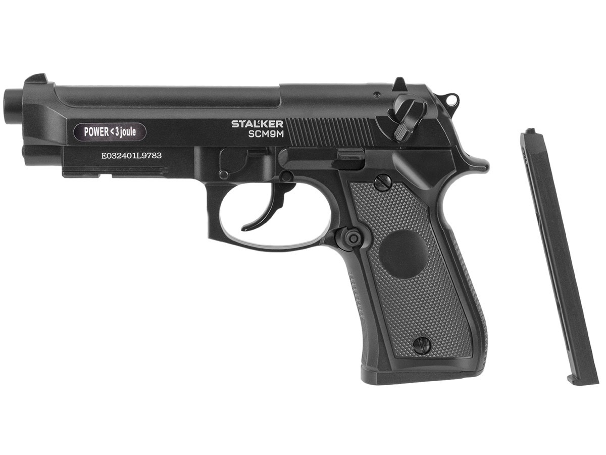Пневматический пистолет Stalker SCM9M, входящий в страйкбольную серию AIRSOFT, создан на основе итальянского пистолета Beretta M9, разработанного для армии США. Это достаточно тяжёлый полноразмерный пистолет, своими массо-габаритными характеристиками и внешним видом похожий на боевой прототип. Имеет дульную энергию менее 3 Джоулей, поэтому не является оружием, что позволяет приобретать его без каких-либо лицензий и разрешений.