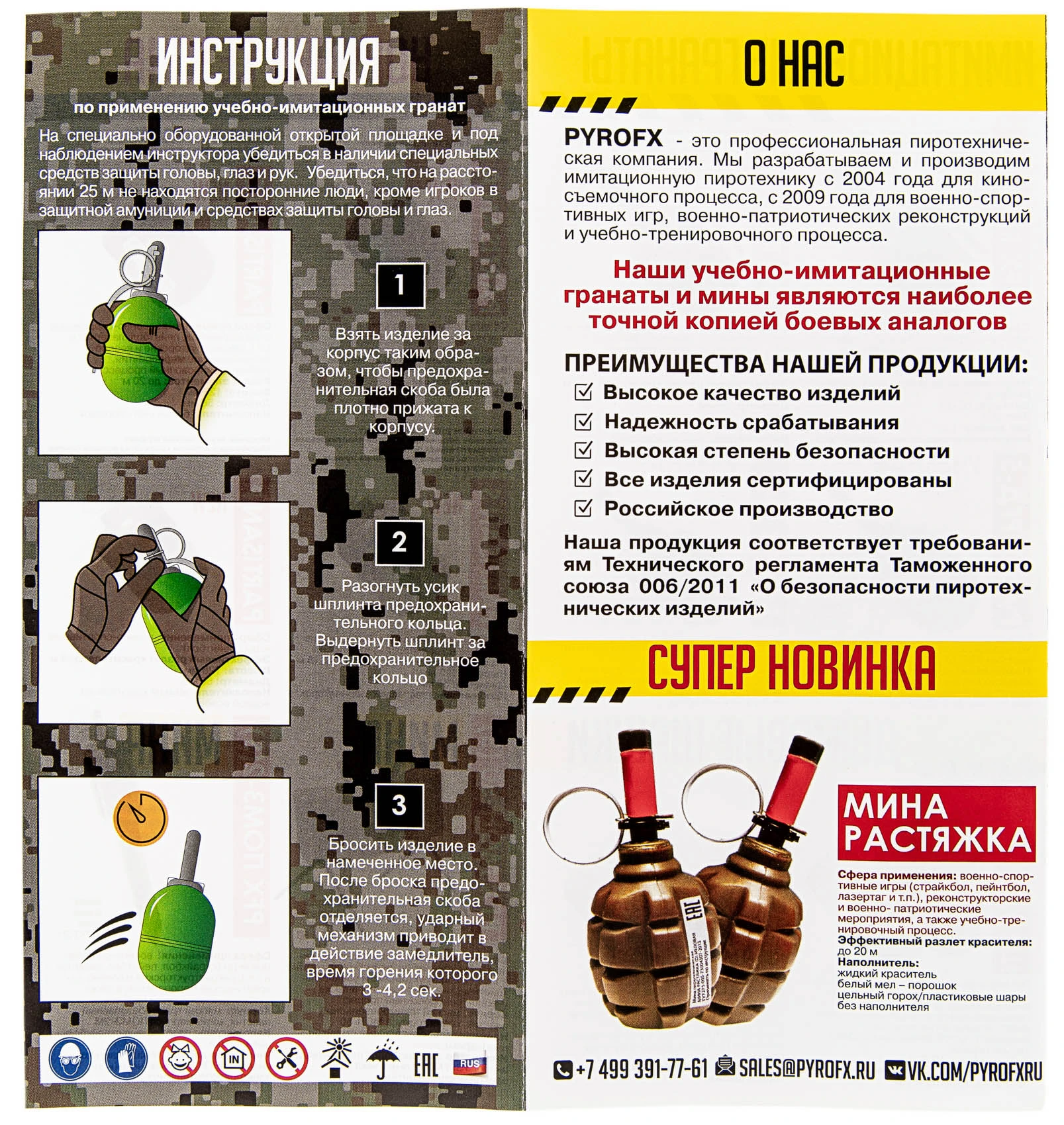 Пиротехнические учебно-имитационные изделия PFX мина – растяжка F-1 (P) предназначена для создания мощного акустического и визуального эффекта (имитации) подрыва мины, маркировки условного противника краской на водной основе.