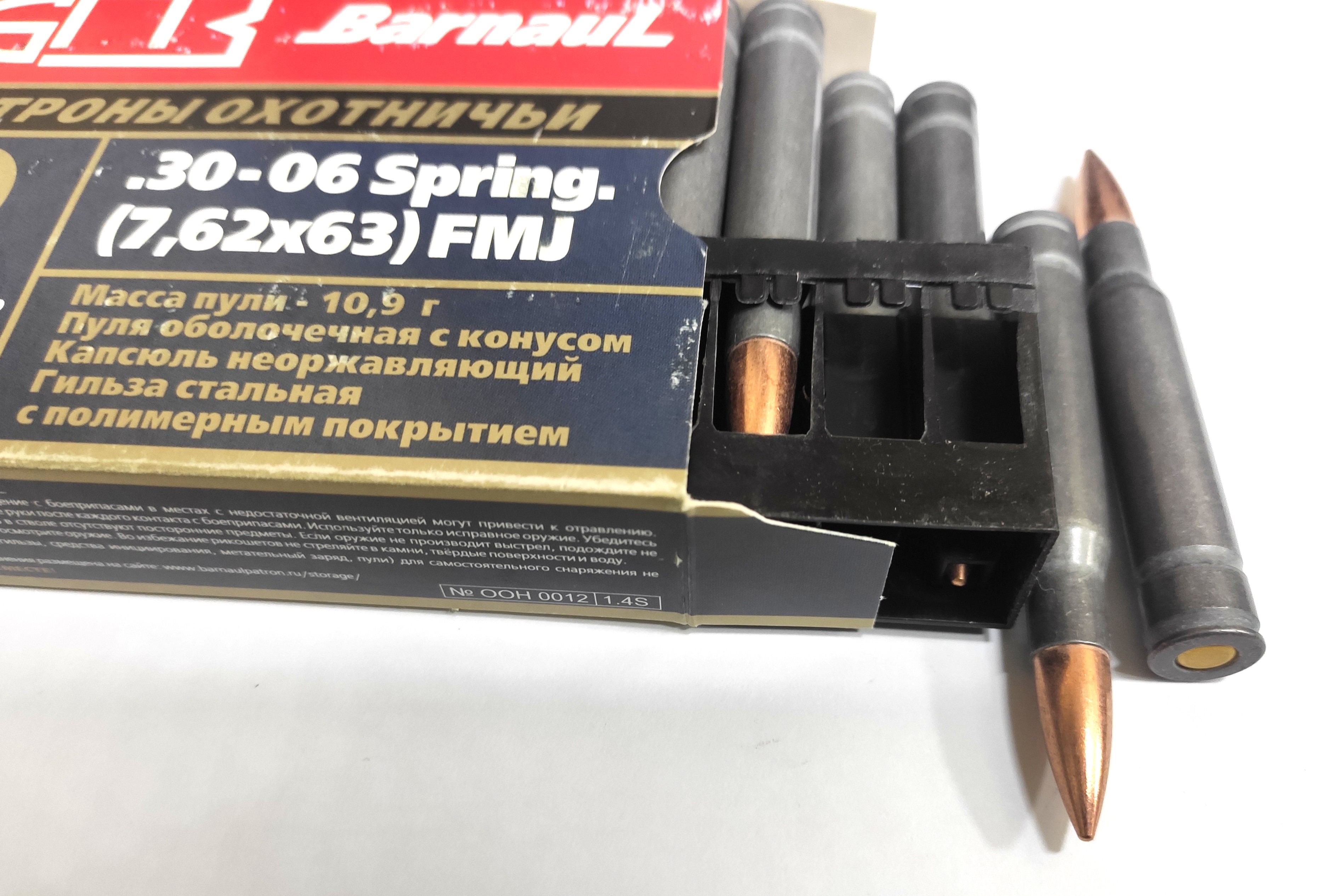 Патрон кал.30-06 Spring с оболоченной пулей (FMJ) Барнаул, вес 10,9 г, стальная гильза с полимерным покрытием.