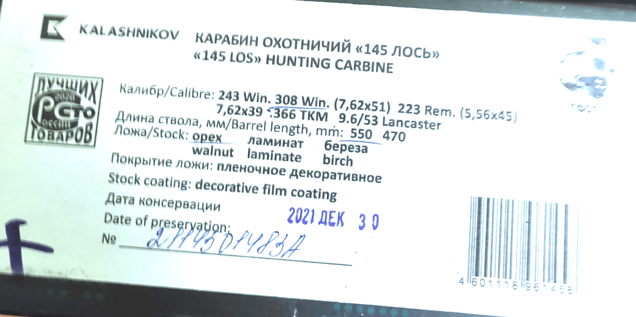 Карабин 2021 года выпуска, без настрела, абсолютно новый, пролежал в заводской коробке без дела.