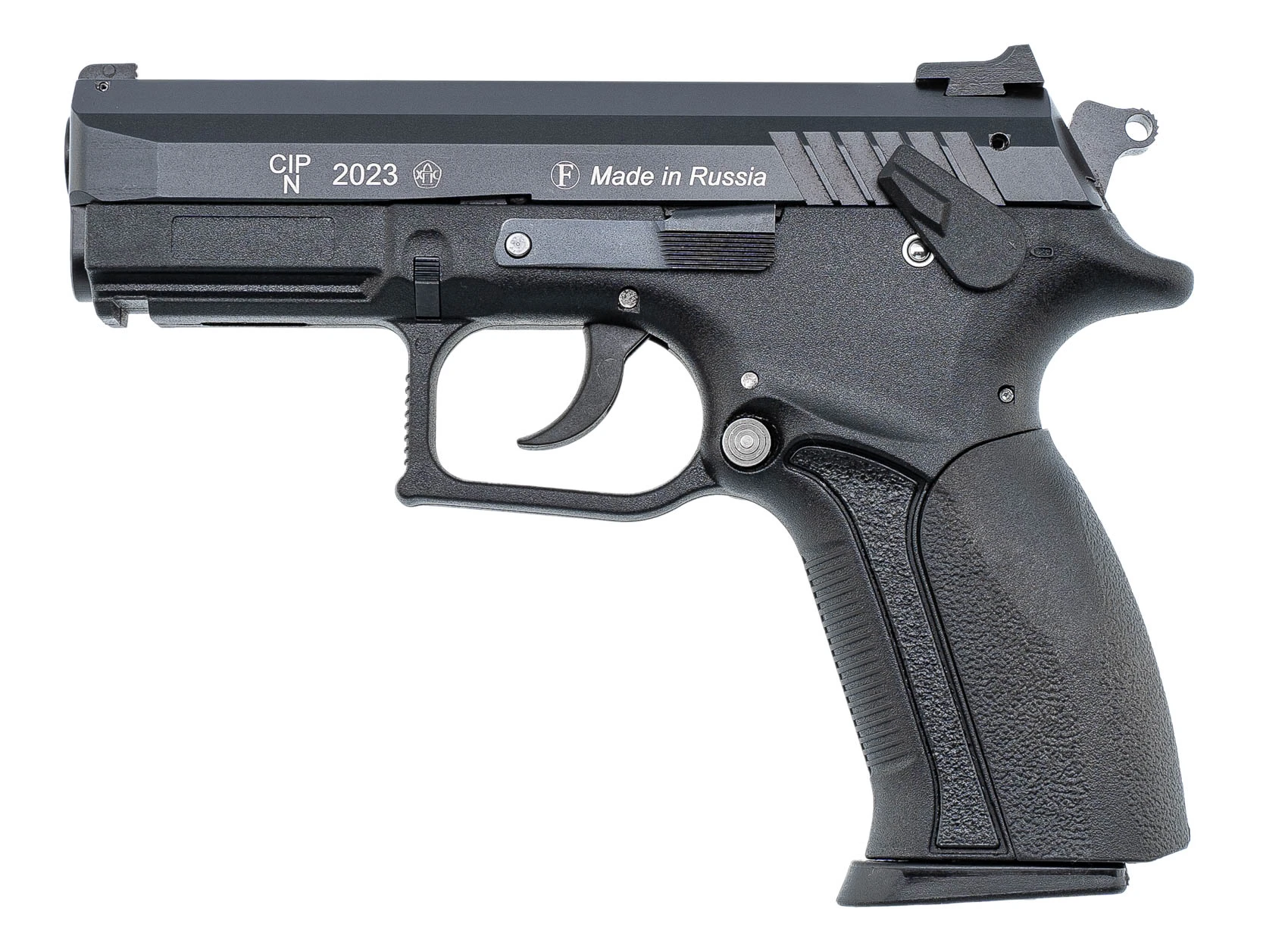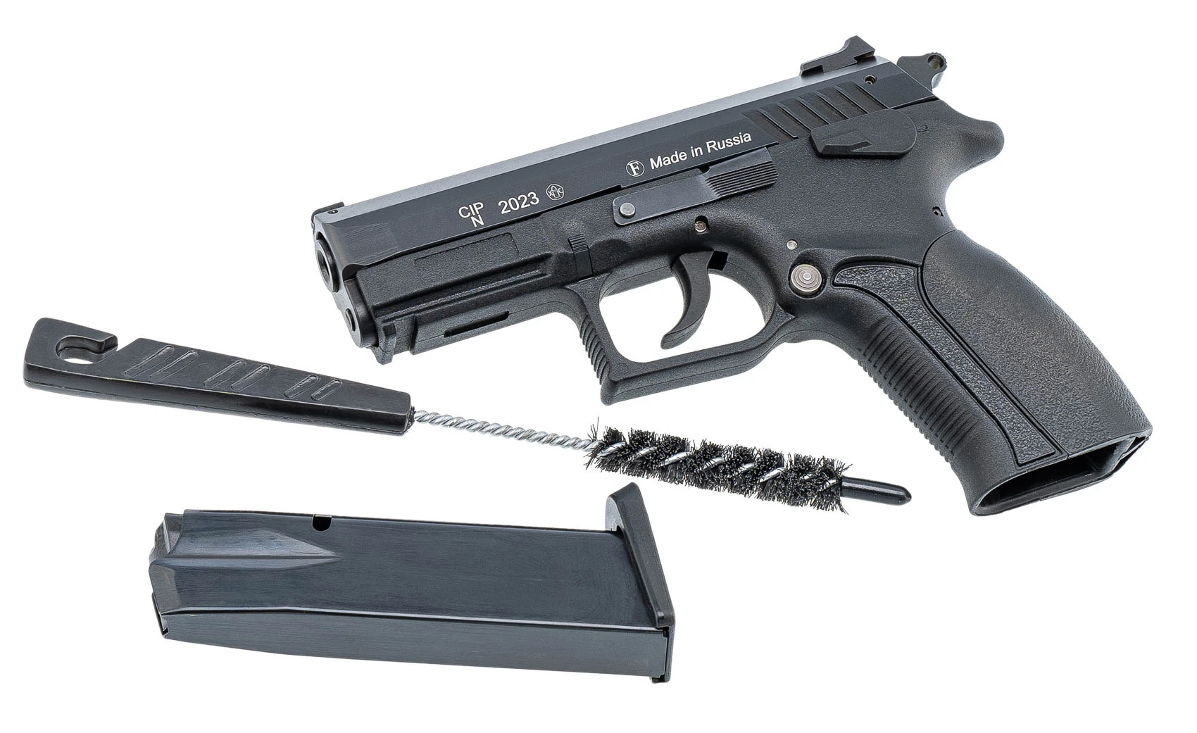 Поставляемый в комплекте металлический магазин вмещает 10 патронов. Безопасность обращения с пистолетом обеспечивает двухсторонний флажковый предохранитель.