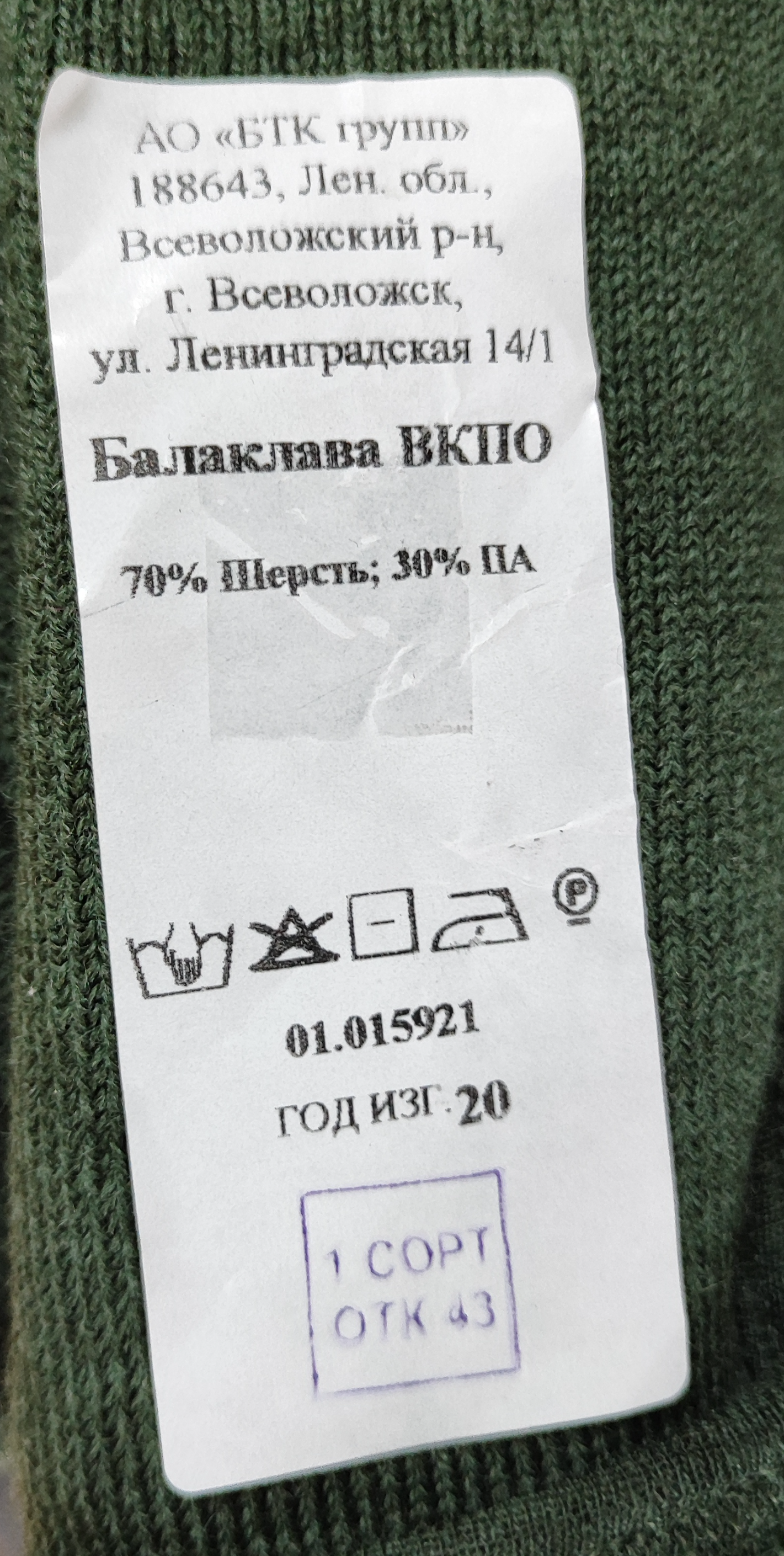 Шапка-маска Балаклава зеленная ВКПО (ГОСТ)