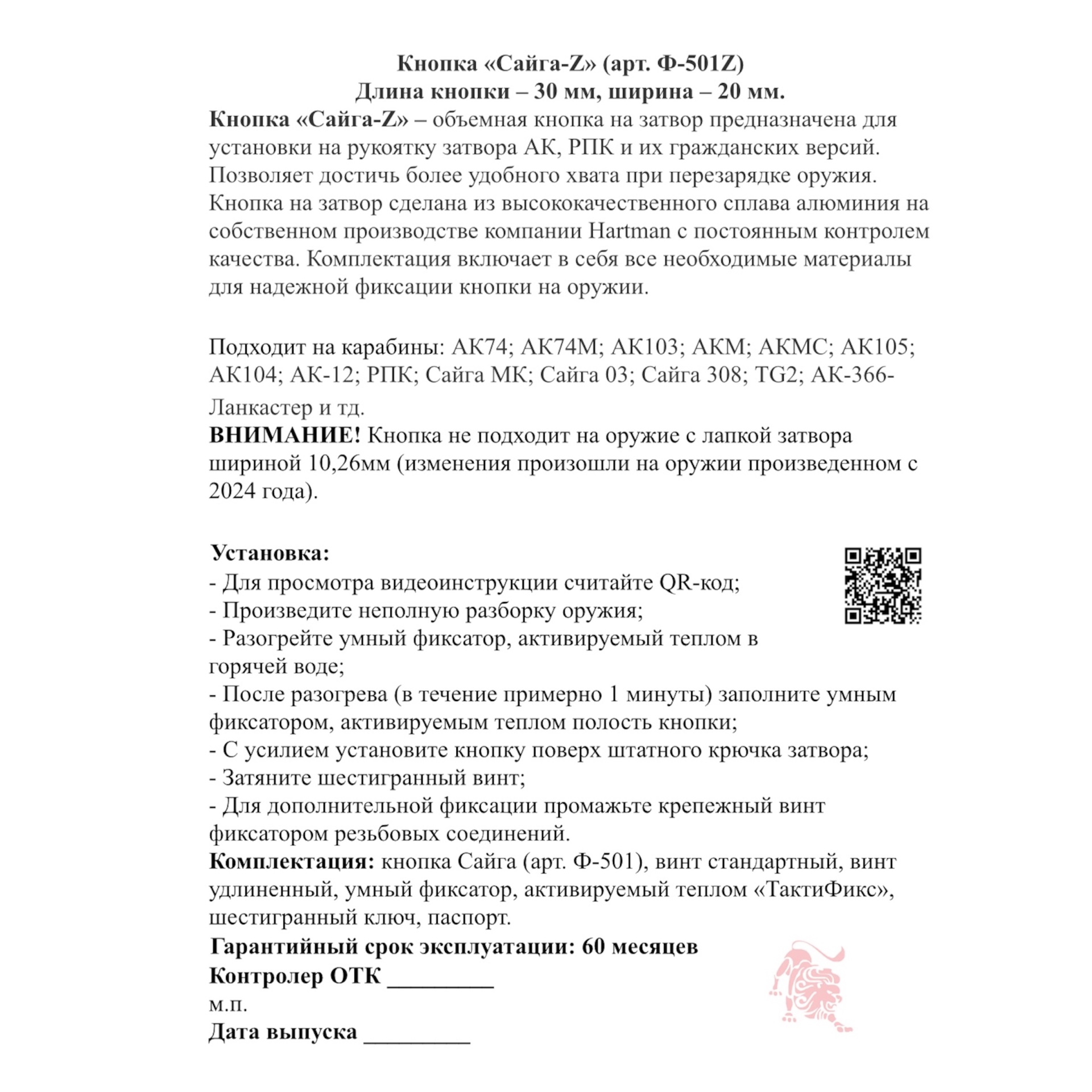 Накладка (кнопка) Сайга Z на рукоятку взвода ТАКТИЧЕСКАЯ HARTMAN (Сайга-АК/Вепрь)